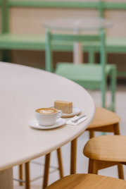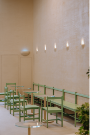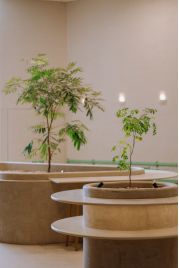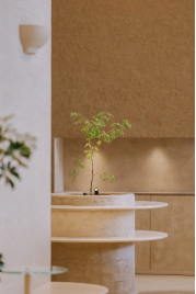 蓝瓶携手Wrk-Shp设计团队,以“自然的平衡”为理念,将深圳湾昔日的潮汐地貌与现代美学融入空间构筑。步入门店,米色基调与层次丰富的饰面渐次铺展:粗砺墙面如沉稳巨石,潮汐冲刷的圆石以巧妙形式融入其中。咖啡吧台不锈钢材质的台面与周围的自然色调形成鲜明对比,宛如岩石中的珍稀金属。刚与柔、自然与现代在此交织。由SUN AT SIX特别制作的座椅与长凳采用双重绿色调,环绕中央绿植,勾勒出轻盈生动的绿意场景,烘托都市绿洲的氛围。