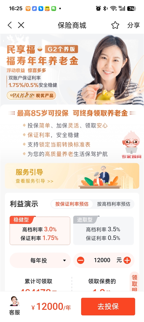 王先生将目光投向了这些专业的保险平台,他的核心诉求是充分运用个税额度。他粗略算了下,以自己约30万的年薪,如果每年存入12000元,预计适用20%的税率档,每年就能节省2400元的个税。王先生在“中国人保APP”上选中了“民享福·福寿年年养老金(G2个养版)”,这款产品的稳健型账户有1.75%的年保证利率写入合同,同时,产品提供了稳健型与进取型两种账户的利益演示,清晰展示了预估收益率,方便理解。