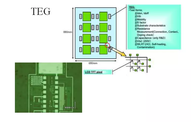在阵列制作的工艺过程中,有许多中间环节的电气性能直接影响到产品的最终性能,必须加以检测。如层间的接触电阻,电极间的电容等。为了检测这些中间环节的电气性能,会在正常显示屏电气线路以外的区域,专门设计一些检测中间性格的电气单元(Test Element Group),并通过专门的TEG 检测设