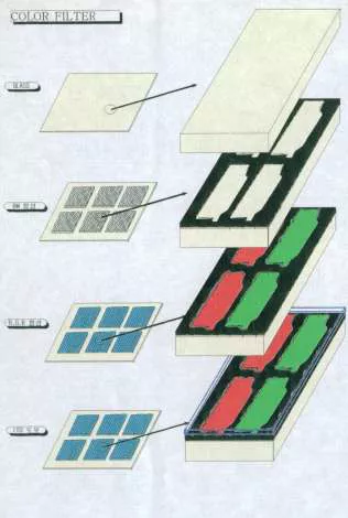 CF 工序是从投入白玻璃基板,到黑矩阵、三基色及ITO 制作完成。具体见下图: