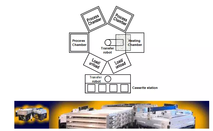 干刻设备与PVD 及PECVD 设备一样,一般采用多腔体枚叶式布局。由于设备内是真空环境,玻璃基板进出设备需要 1-2 个减压腔。其余腔体为工艺处理腔。见以下示意图: