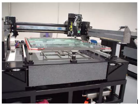为了提高产品的合格率,在每次显影后和刻蚀后,一般会作一次光学检测。一般采用线性 CCD 对玻璃基板上的图形进行扫描,将扫描后的图像作计算机合成处理后,与设计图形作比对,以发现可能存在的问题。此过程即称为自动光学检测。其典型设备如下图: