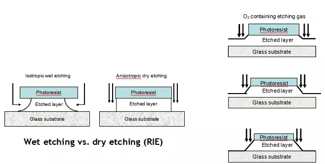 干刻是利用等离子体作为刻蚀气体,等离子体与暴露在外的膜层进行反应而将其刻蚀掉。等离子体刻蚀有各向异性的特点,容易控制刻蚀后形成的截面形态;但但高能等离子体对膜的轰击会造成伤害。湿刻与干刻的原理见下 图: